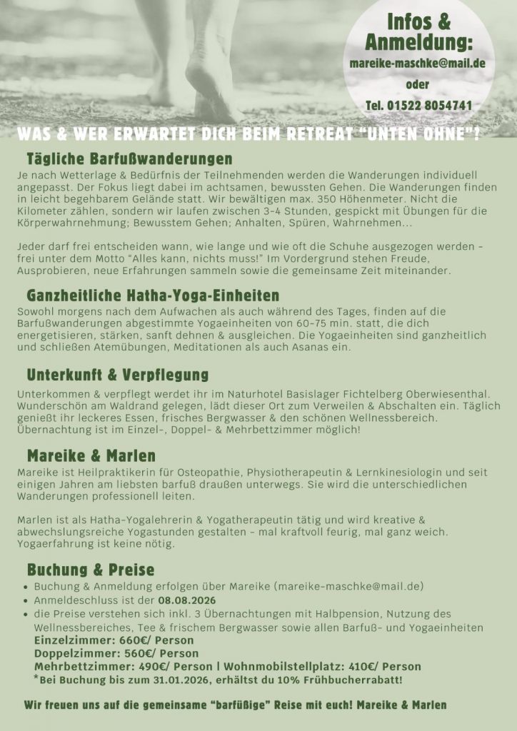 - Buchung & Anmeldung erfolgen über Mareike (mareike-maschke@mail.de)